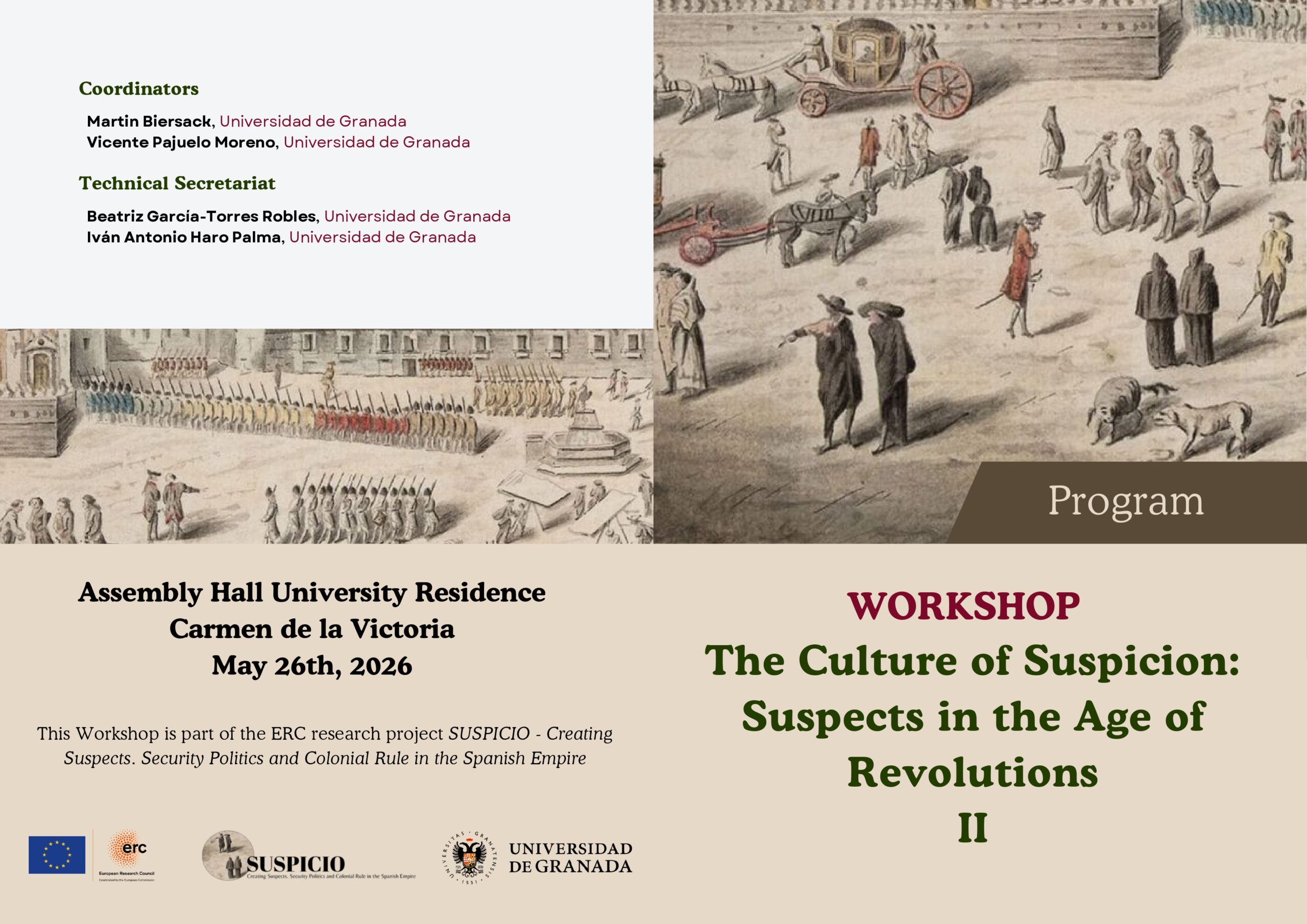 EL grupo PAIDI HUM 680 les invita a la Workshop The Culture of Suspicion: Suspects in the Age of Revolutions II, que tendrá lugar el próximo 26 de mayo. En ella, participará nuestro miembro Pablo Hernández Sau con su intervención titulada «Movimientos sospechosos. Reglamentos policiales y mecanismos judiciales en la persecución de sospechosos en movimiento en la Luisiana revolucionaria».