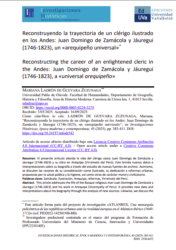 LADRÓN DE GUEVARA ZUZUNAGA, Mariana, “Reconstruyendo la trayectoria de un clérigo ilustrado en los Andes: Juan Domingo de Zamácola y Jáuregui (1746-1823), un «arequipeño universal»”, en Investigaciones Históricas, época moderna y contemporánea, 45 (2025), pp. 383-411. DOI: https://doi.org/10.24197/m6sdr542