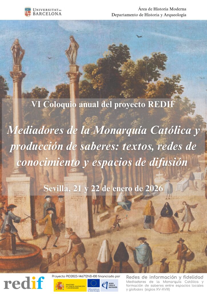 El grupo PAIDI HUM 680 les invita al VI Coloquio anual del proyecto REDIF, titulado Mediadores de la Monarquía Católica y producción de saberes: textos, redes de conocimiento y espacios de difusión, que tendrá lugar entre el 21 y 22 de enero de 2026 en en la Escuela de Estudios Hispano-Americanos del CSIC, en Sevilla. Las sesiones se podrán seguir también en línea, a través del siguiente enlace.