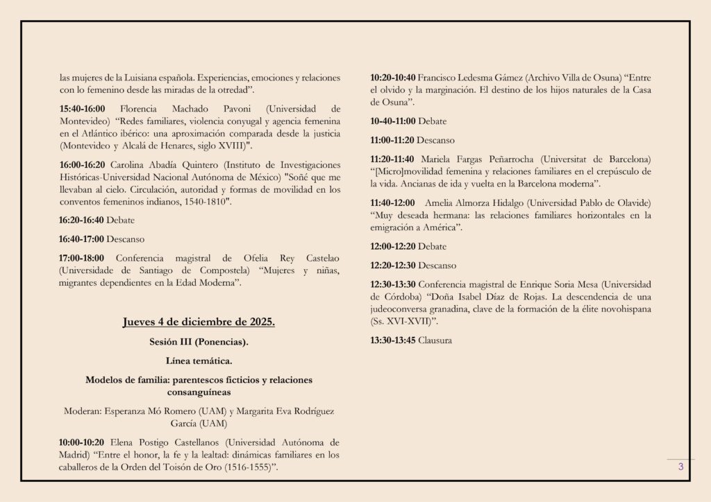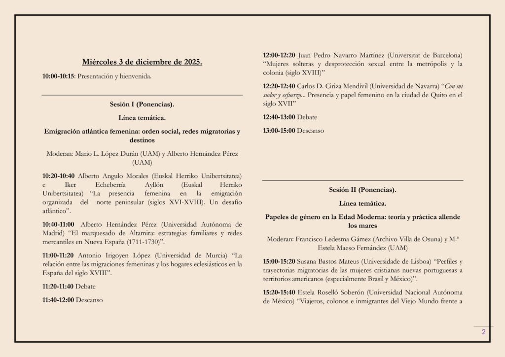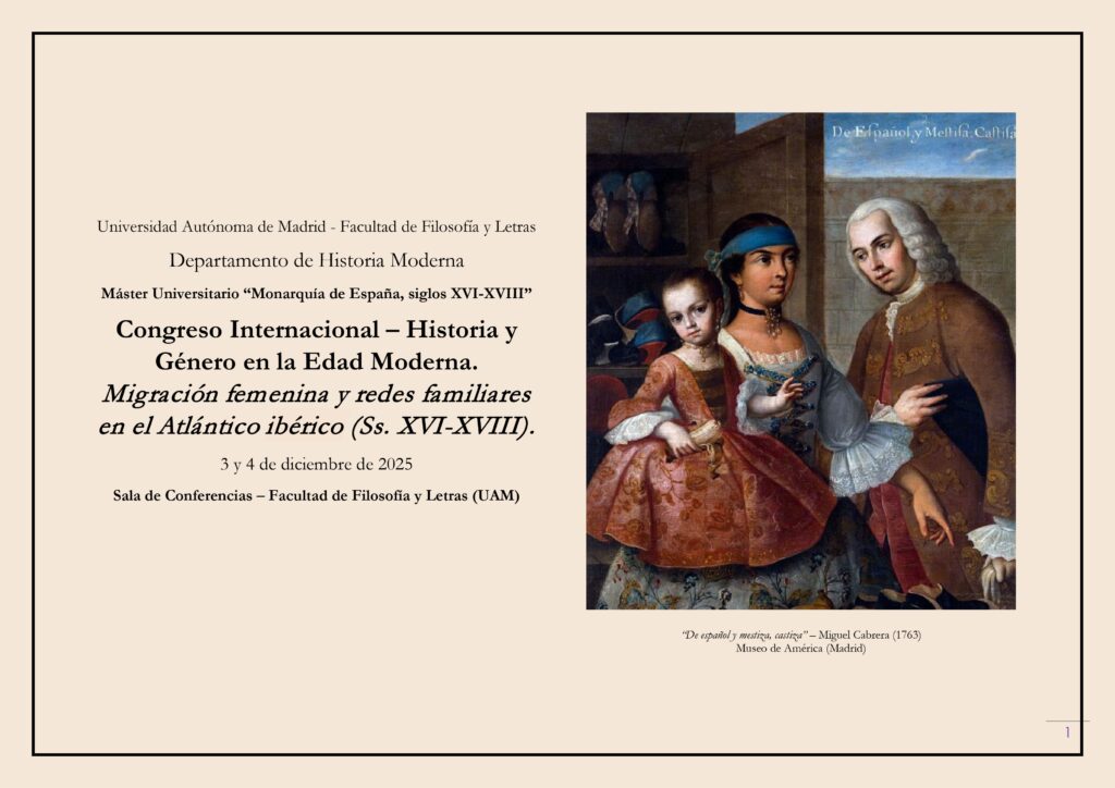 Nos complace anunciar la celebración del Congreso Internacional «Historia y Género en la Edad Moderna. Migración femenina y redes familiares en el Atlántico ibérico (ss. XVI-XVIII)» el 3 y 4 de diciembre en la Facultad de Filosofía y Letras de la Universidad Autónoma de Madrid. Organizado por Esperanza Mó Romero, Margarita E. Rodríguez García, Mª Estela Maeso Fernández, Alberto Hernández Pérez y Mario L. López Durán, las sesiones se desarrollarán en base a las líneas temáticas «Emigración atlántica femenina: orden social, redes migratorias y destinos», «Papeles de género en la Edad Moderna: teoría y práctica allende los mares» y «Modelos de familia: parentescos ficticios y relaciones consanguíneas».