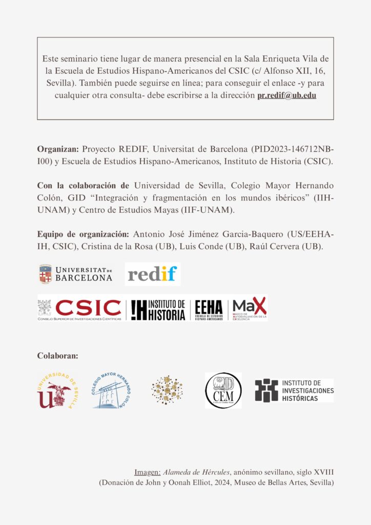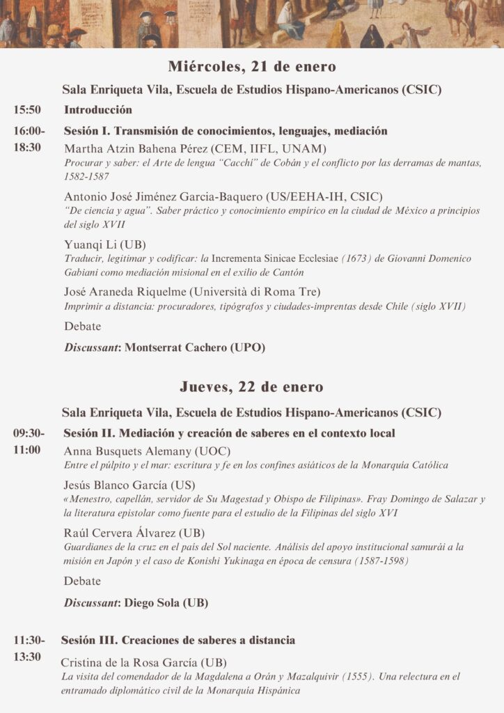Nos complace anunciar la celebración del VI Coloquio anual del proyecto REDIF «Mediadores de la Monarquía Católica y producción de saberes: textos, redes de conocimiento y espacios de difusión». El coloquio se desarrollará en la Escuela de Estudios Hispano-Americanos (Sala Enriqueta Vila, CSIC) entre el 21 y 22 de enero.