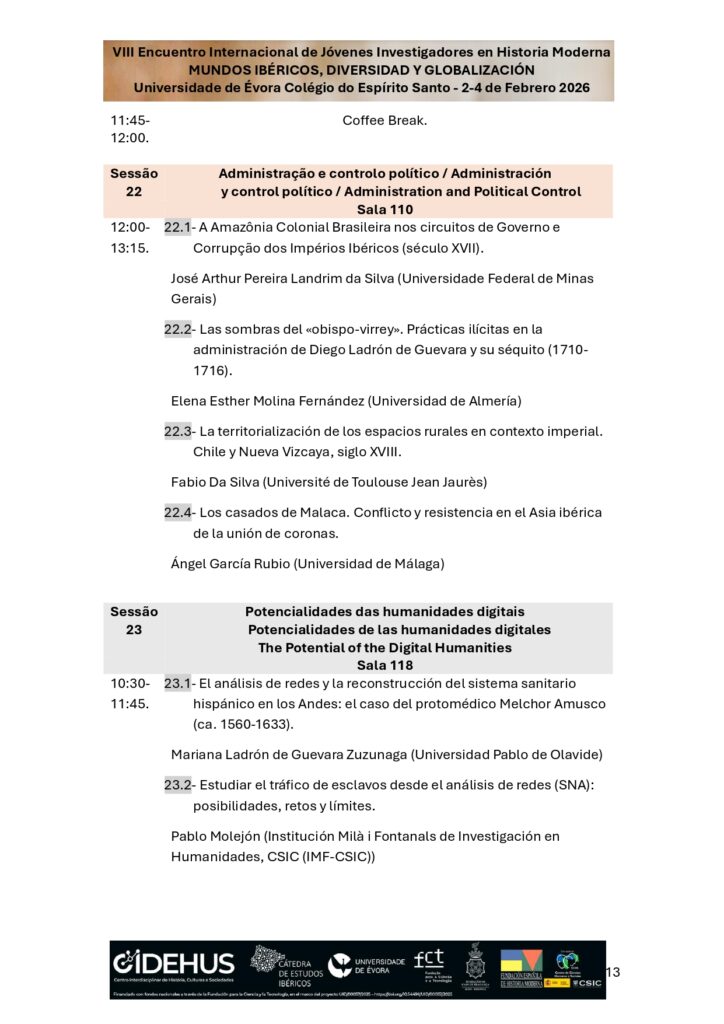 Con motivo de la celebración del VIII Encuentro Internacional de Jóvenes Investigadores en Historia Moderna «Mundos ibéricos, diversidad y globalización», participarán en el evento Mario Luis López Durán y Mariana Ladrón de Guevara Zuzunaga.