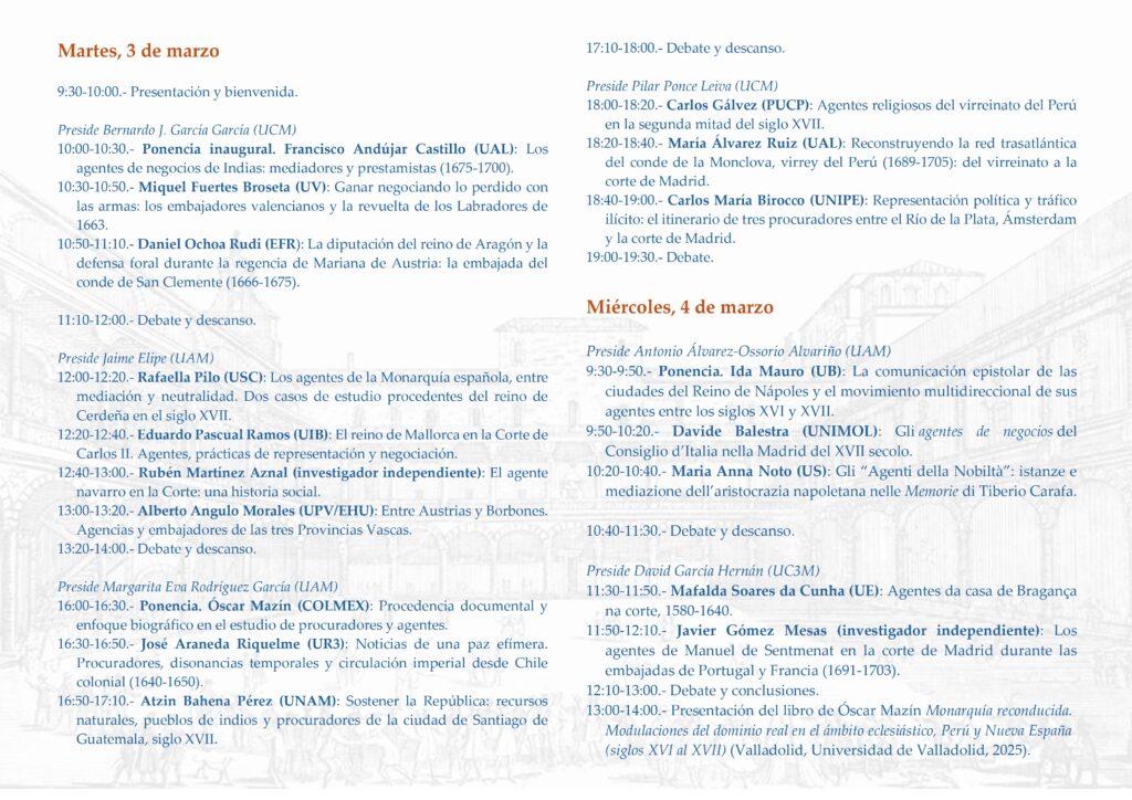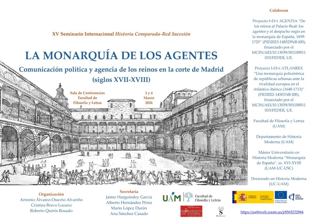 Nos complace anunciar la celebración del XV Seminario Internacional Historia Comparada-Red Sucesión «La monarquía de los agentes. Comunicación política y agencia de los reinos en la corte de Madrid (siglos XVII-XVIII)», organizado por Antonio Álvarez-Ossorio Alvariño, Cristina Bravo Lozano y Roberto Quirós Rosado.