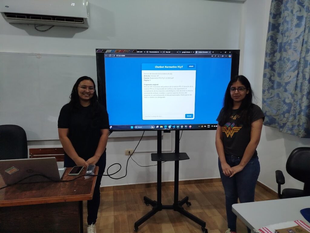 En este desafío debieron desarrollar y presentar un prototipo funcional del Chatbot Normativo FCyT, trabajando en equipos, en un tiempo limitado y utilizando exclusivamente los recursos disponibles en el laboratorio ATY, equipado con laptops Acer Predator Helios 16S AI y una red dedicada para el trabajo colaborativo intensivo.