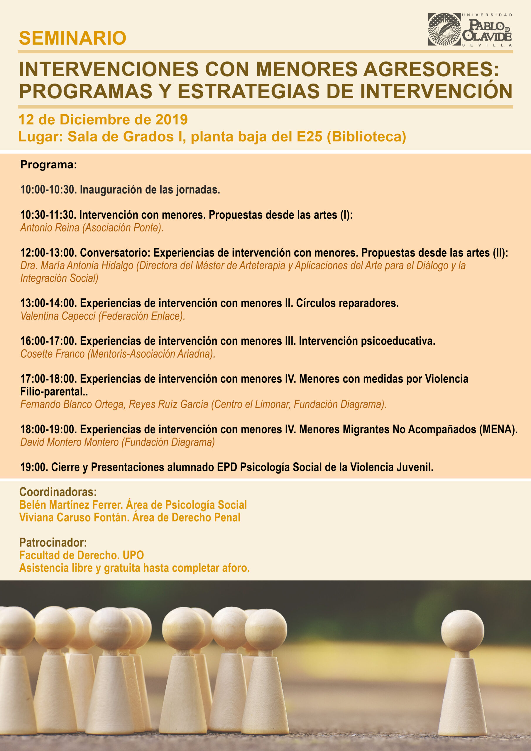 El programa cuenta con profesionales vinculados a la intervención con menores desde distintos ámbitos. Así, el Seminario ha dado comienzo con la ponencia de Antonio Reina de la Asociación Ponte quien ha hablado sobre Propuestas desde las artes para la intervención con menores, tema que también será abordado por María Antonia Hidalgo, directora del Máster en Arteterapia y Aplicaciones del Arte para el Diálogo y la Integración Social de la Universidad Pablo de Olavide. Participarán también en la jornada, cuya asistencia es libre y gratuita y continúa esta tarde, especialistas que aportarán sus experiencias en la intervención con menores de la Federación Enlace; Mentoris-Asociación Ariadna; y la Fundación Diagrama. Estudiantes de la asignatura (EPD) Psicología Social de la Violencia Juvenil cerrarán el Seminario con presentaciones de sus trabajos.