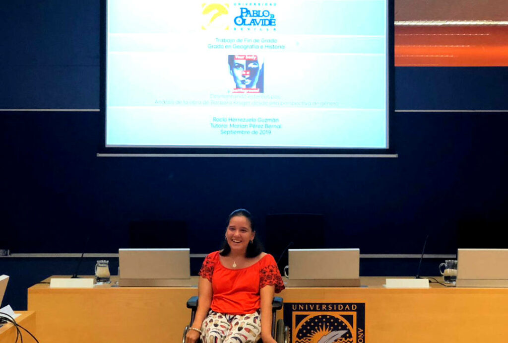 La estudiante de la Universidad Pablo de Olavide Rocío Herrezuelo Guzmán, con un 92% de discapacidad reconocida, ha defendido su trabajo de fin de grado titulado titulado «Desmontando estereotipos. Análisis de la obra de Barbara Kruger desde una perspectiva de género», tutorizado por la profesora del Departamento de Geografía e Historia Marian Pérez Bernal. En él se analizan las fotografías de la artista estadounidense y su relación con las corrientes feministas de los años 70 y 80.