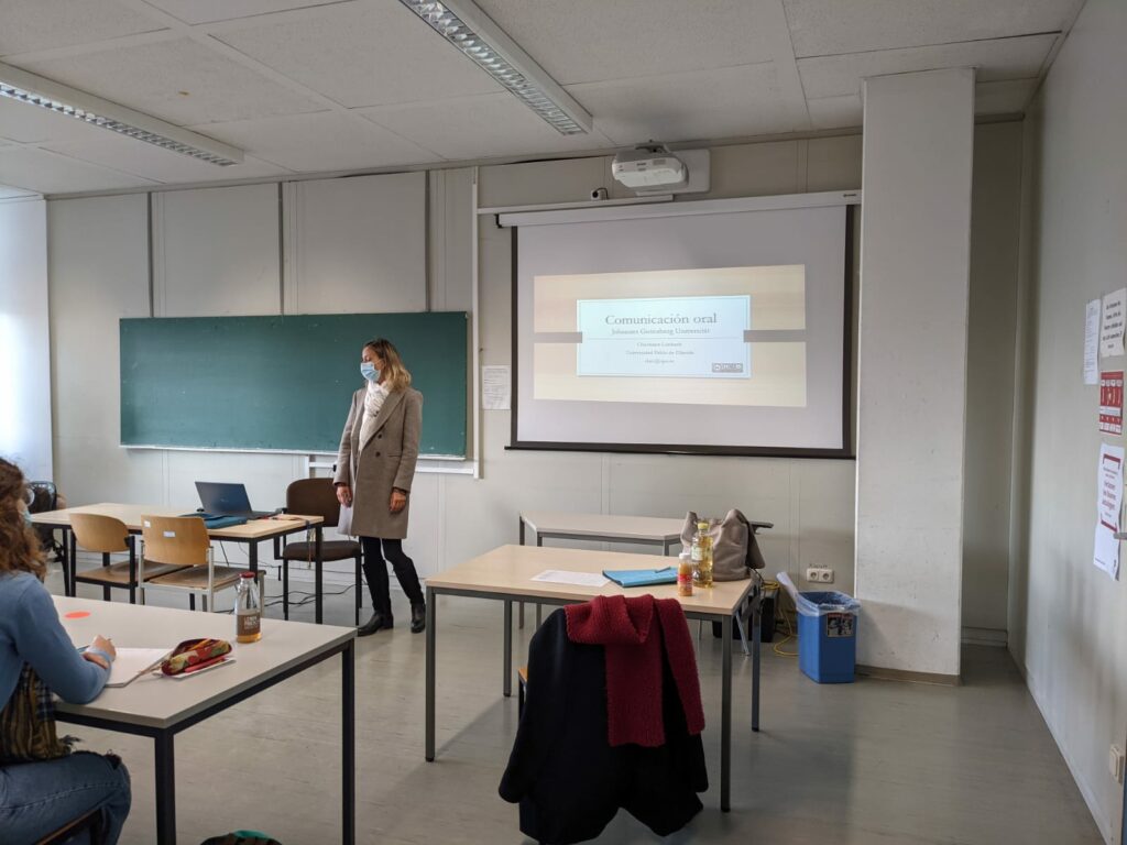 Christiane Limbach, profesora del Departamento de Filología y Traducción de la Universidad Pablo de Olavide, imparte clases de traducción y comunicación oral durante 5 días en la Johannes-Gutenberg-Universität en Maguncia (Alemania) cumpliendo con todas las medidas Covid-19 que se han implementado en Alemania.
