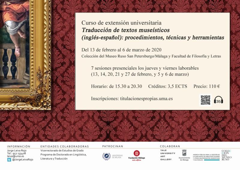 El departamento de Traducción e Interpretación de la Universidad de Málaga, en colaboración con el Museo Ruso San Petersburgo/Málaga, organizó del 13 de febrero al 6 de marzo de 2020 el curso de extensión universitaria «La traducción de textos museísticos (inglés-español): procedimientos, técnicas y herramientas» bajo la dirección de Jorge Leiva Rojo.