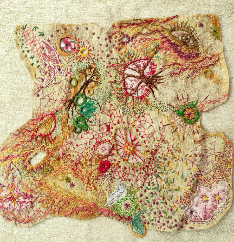 Consciente de que los bordados van de la mano con los textiles, comencé también a interesarme en el tema de teñidos con elementos naturales llegando finalmente a la técnica de óxido sobre textiles la cual me atrajo muchísimo y con la que comencé a experimentar y estudiar dejando a un lado los límites ya conocidos y convencionales donde se aplica el bordado como la moda, la artesanía, las manualidades y el comercio.