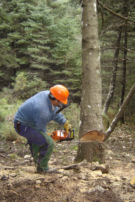 Thinning treatments were conducted during October 2004 in stands with previously comparable basal area and stand structure. Three treatments levels, each one replicated in two 1000 m2 plots, were considered: reduction of 60% of the total basal area in the plot, reduction of 30% total basal area and an unthinned control. Selection of the trees to be removed was performed considering two additional criteria: (i) to achieve a diameter class distribution after thinning as equitative as possible (this mean the most abundance size classes were preferentially felled), and (ii) to avoid that, conversely to common thinning practice, the spatial distribution of remaining trees is regular (once the number of trees to be felled in each size-class was fixed, the specific target individuals were selected by a random procedure).