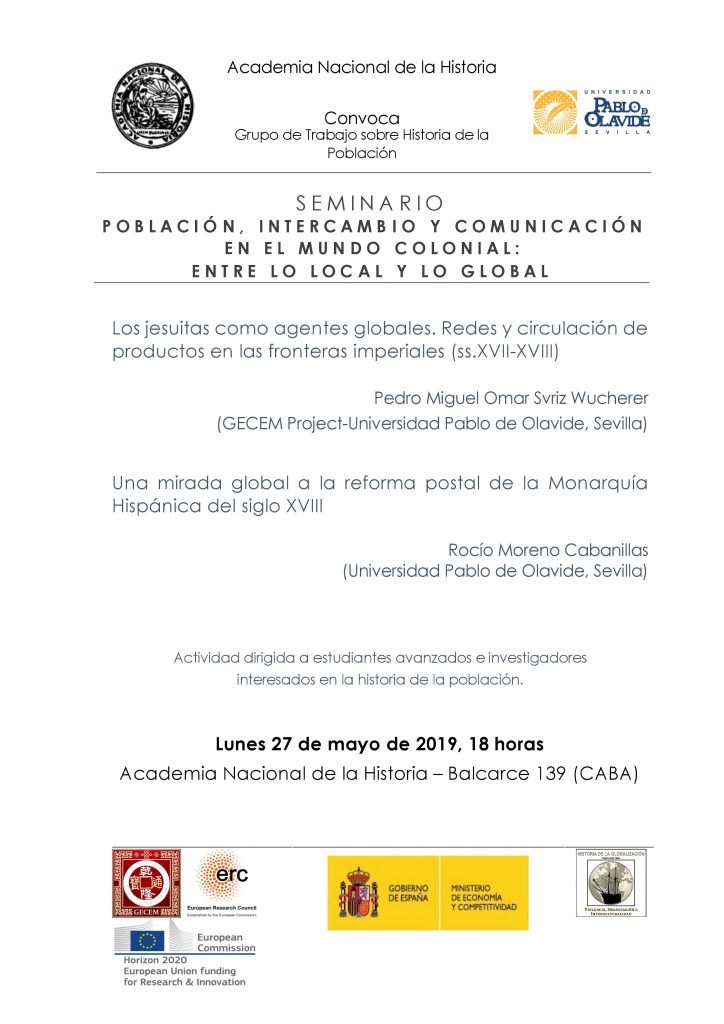 El próximo lunes 27 de mayo a las 18:00 horas tendrá lugar la celebración del Seminario Población, intercambio y comunicación en el mundo colonial: entre lo local y lo global en la Academia Nacional de la Historia (Balcarcel, 139, CABA). La actividad está convocada por el Grupo de Trabajo sobre Historia de la Población y en ella intervendrán como ponentes Pedro Miguel Omar Svriz Wucherer, miembro del proyecto GECEM, y Rocío Moreno Cabanillas, también de la Universidad Pablo de Olavide. Pueden consultar el cartel del evento a continuación.