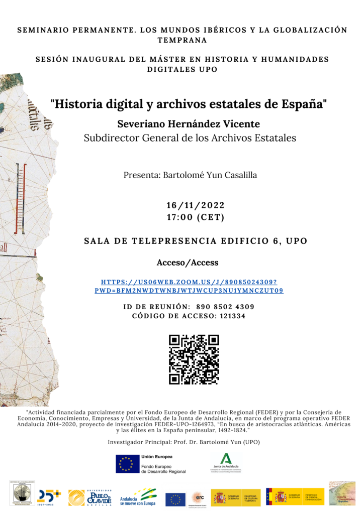 El próximo miércoles 16 de noviembre a las 17:00 horas de la tarde (CET) D. Severiano Hernández Vicente pronunciará una conferencia titulada «Historia digital y archivos estatales de España» como sesión inaugural, tras el verano y comienzo de curso, del Seminario Permanente «Los mundos ibéricos y la globalización temprana» en este nuevo curso y como sesión de apertura del Máster en Historia y Humanidades Digitales de la UPO.