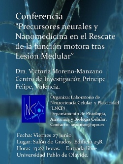 El Laboratorio de Neurociencia Celular y Plasticidad (LNCP) de la Universidad Pablo de Olavide tiene el placer de invitarles a la conferencia titulada: "Precursores Neurales y Nanomedicina en el Rescate de la Función Motora tras Lesión Medular", que será impartida por el Dra. Victoria Moreno-Manzano, Centro de Investigación Príncipe Felipe, Valencia.