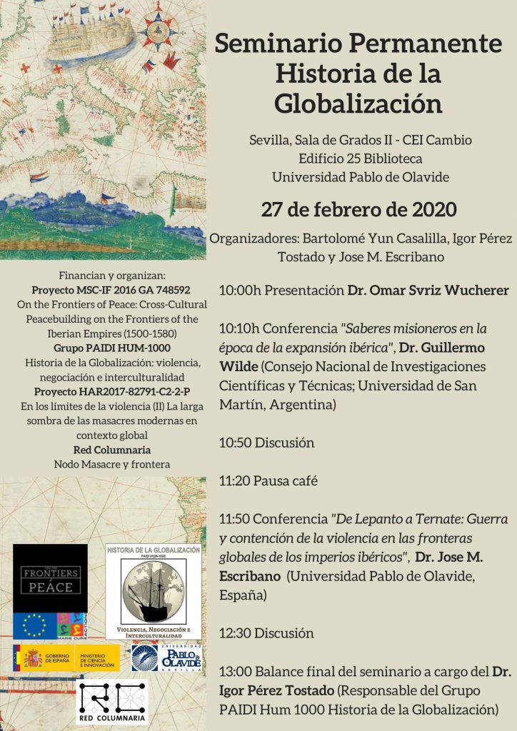La sesión está organizada y financiada por el Proyecto H2020 MSC-IF 2016 GA 748592 “On the Frontiers of Peace: Cross-Cultural Peacebuilding on the Frontiers of the Iberian Empires (1500-1580)”, el Grupo PAIDI HUM-1000: “Historia de la Globalización: violencia, negociación e interculturalidad”, el proyecto Proyecto HAR2017-82791-C2-2-P «En los límites de la violencia (II) La larga sombra de las masacres modernas en contexto global» y el «Nodo Masacre y Frontera» de la Red Columnaria.