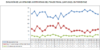 Ese interrogante, cuya respuesta es categóricamente negativa, nos sitúa ante el sugerente tema de la conciencia fiscal de los ciudadanos. De ella se ocupan los estudios sobre sociología tributaria, entre los que aporta bastante luz el análisis estadístico que publica periódicamente el Instituto de Estudios Fiscales, organismo del Ministerio de Hacienda. Desde 2001 se han venido elaborando una serie de informes anuales bajo el título “Opiniones y actitudes fiscales de los españoles”. Entre otros muchos aspectos, en ellos se pregunta a los entrevistados sobre la evolución, extensión, causas, tipología, efectos y justificación del fraude fiscal. Nos interesa ahora simplemente dar breve noticia de los datos sobre esta última dimensión del fraude que aparecen en el último informe, correspondiente al ejercicio 2022 (Documento de Trabajo del IEF 7/2023):