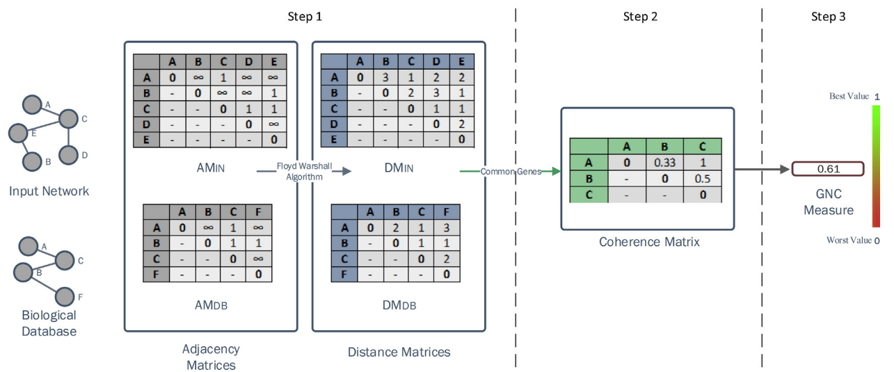 We propose a new measure, named gene network coherence (GNC), to rate the coherence of an input network according to different biological databases. In this sense, the measure considers not only the direct gene–gene relationships but also the indirect ones to perform a complete and fairer evaluation of the input network. Hence, our approach is able to use the whole information stored in the networks. A GNC JAVA-based implementation is available at: http://fgomezvela.github.io/GNC/.