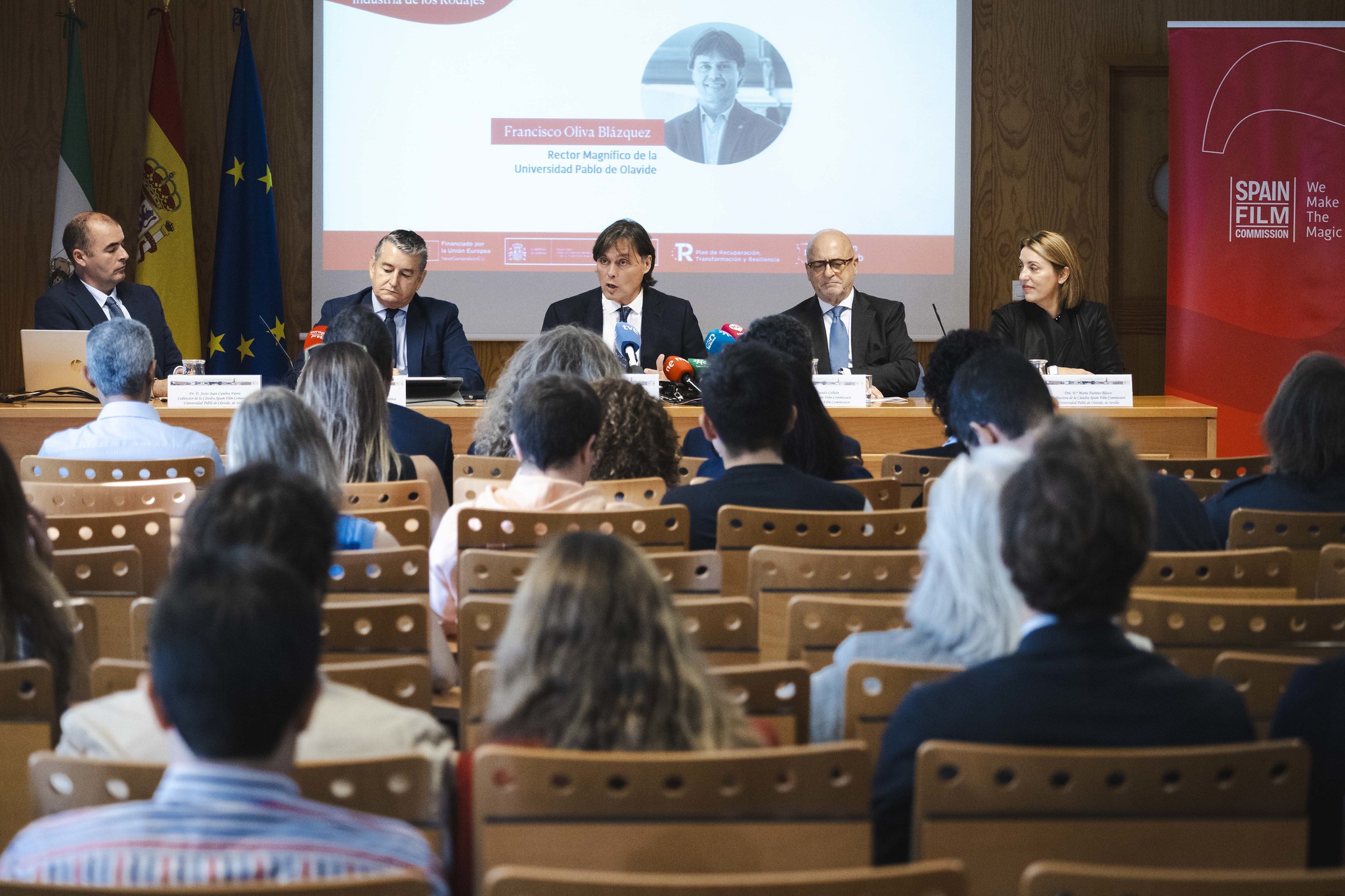 23/10/2024. Spain Film Commission y la Universidad Pablo de Olavide (UPO) han presentado la Cátedra de Industria de los Rodajes. D. Antonio Sanz Cabello, consejero de la Presidencia, Interior, Diálogo Social y Simplificación Administrativa de la Junta de Andalucía, clausuró la presentación.