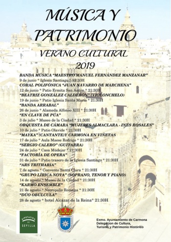 La agenda del Verano Cultural 2019 incluye conciertos en los principales monumentos de la ciudad (Ciclo Música y Patrimonio), representaciones teatrales (la mayoría con fines benéficos), conferencias, exposiciones, monólogos, zarzuela y muchas más actividades.