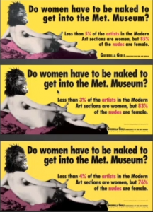 ¿Tienen que estar desnudas las mujeres para entrar en el Met. (Metropolitan) Museum? Menos del 5% de los artistas en el Arte Moderno son mujeres, pero el 85% de los desnudos son femeninos.