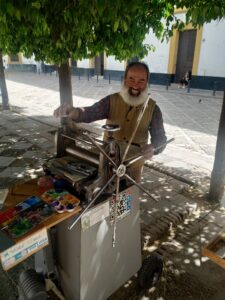 Entre todo este maremágnum de lenguas, rostros, estilos, se encuentran personas que habitan la ciudad de otro modo: músicos, malabaristas, vendedoras de abanicos, de frutos secos, de incienso; mujeres que te leen la buenaventura en la palma de la mano con una ramita de romero, o incontables guías turísticos que ofrecen sus servicios por el entorno del trinomio Catedral-Alcázar-Archivo de Indias. Yo tengo cierta debilidad, y no es casual, por los pintores callejeros. Entiéndase que este epígrafe está dedicado principalmente a artistas que venden su obra para su subsistencia, e incluyo a pintores que hacen de la calle y demás espacios públicos su hogar por unas horas. Pintores que plasman el paisaje urbano del que también son parte. He querido con este modesto reportaje, brindar un homenaje a éstos incombustibles artistas que están día a día a pie de calle, con el frío húmedo del Guadalquivir que penetra hasta los huesos en el otoño-invierno, y el calor sofocante, azotador de nuestro verano ( desde hace un tiempo desde abril a noviembre). Estos artistas se sienten parte de la ciudad aunque sean foráneos. Tanto los que han venido de otras partes de España, como los que proceden de cualquier parte del mundo han elegido quedarse aquí, sentirse como un sevillano más y compartir nuestra bella ciudad. Son además, – y en esto creo que las instituciones deberían hacer algo- promotores de la ciudad en el mundo. Los trabajos que la gente les compra, no son postales que se envían y se guardan en un cajón. Sus obras las cuelgan en las paredes, y hablan de los paisajes, del pintor o pintora que los hizo, y las narraciones basadas en: cómo compraron tal cuadro, qué significa, la leyenda que hay tras éste o dónde se localiza tal o cual paisaje… crean historias, además de pasear las múltiples estampas de Sevilla por el mundo.