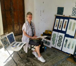 Sarah nació en Dinamarca, donde trabajaba en el campo del diseño textil. Esta profesión requiere del contacto habitual con productos químicos, lo que le provocó un deterioro de su salud, por lo que tuvo que abandonar su profesión y su frío y húmedo país. Cuando vino a Sevilla, tenía los pulmones encharcados. Gracias al buen clima de la ciudad mejoró bastante y decidió establecerse aquí. Al principio pintaba el paisaje de las calles y los jardines de la ciudad con acuarelas, que es lo mejor para su salud. Descubrió la geometría de los azulejos, artesonados y puertas del Real Alcázar y decidió centrar su trabajo en ese campo. Le gusta el contacto con la gente, aunque a veces como ella dice, se acercan «locos que buscan un sitio donde dejar sus problemas «. Es lo que tiene estar todo el día en la calle. Afirma, que además de artista ha de ejercer a veces de psicóloga. La calle tiene rachas, a veces demasiado turismo, a veces el ayuntamiento hace «limpias», y también esta la soledad de la pandemia pasada. Para ella es un lujo vivir como lo hace, y ganarse la vida con la pintura, pero reconoce que la calle no es para cualquiera. A veces se acerca alguien y admira su obra y su forma de vida, y le parece un sueño, pero no reparan en que no se gana sino para sobrevivir, no es un trabajo para ahorrar. Si quieres comprarte una casa nadie te va a dar una hipoteca. Te ayuda a llegar a fin de mes. Uno de los puntos que más destaca en la vida en la calle, es el respeto. Respeto a los vecinos, al entorno , a los visitantes y a la ciudad. El respeto es fundamental para la convivencia. No comparte a grafiteros que estampan su afición en lugares históricos, paredes o puertas antiguas, sin embargo admite grafitis en lugares que previa autorización ayuden a embellecer la ciudad. O los artistas de tiza que utilizan el entorno urbano para plasmar su arte, y no es nocivo, pues con agua se borra. En resumen, convivencia y respeto mutuo.