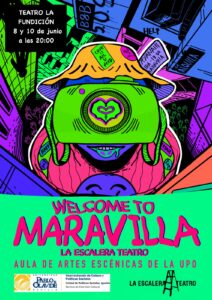 M: He tenido la oportunidad de participar en tres obras teatrales. Normalmente, se suele realizar una obra por año, pero debido a la situación del Covid, hemos tenido algunos cambios. En realidad, podría decir que he realizado cuatro obras en total. En la primera obra, pude unirme a la gira de una producción anterior llamada «Puntos Ciego». Esta obra es muy interesante, ya que aborda el tema de la identidad. Fue durante ese año que la antigua directora, Mariana, comenzó a explorar el tema de la muerte y creó una obra que se estrenó en el Teatro La Fundición aquí en Sevilla. Al año siguiente, hubo un cambio de director y Piermario Salerno asumió el cargo, siendo el director actual. Piermario creó su propia versión de «Madame la Mort», que es completamente diferente a la obra anterior de Mariana. Son dos mundos completamente distintos. Después, llegó la pandemia del Covid y nos vimos obligados a adaptarnos. Durante ese tiempo, se realizaron cápsulas de mini teatro, aunque no participé en ellas. Creo que algunas de estas cápsulas están disponibles en YouTube. Eran pequeños cortometrajes muy vistosos y bonitos. En total, creo que se hicieron seis durante el año de la pandemia. El año pasado, estrenamos la obra «Welcome to Maravilla», la cual fue un gran éxito. Además, con esta última obra, ganamos un premio de cartel y también la obra se encuentra disponible en YouTube (https://www.youtube.com/watch?v=TYL7jl4BBZk). Y este año, he participado en el proceso creativo de «Cosmolovers», la obra que se estrenó recientemente.