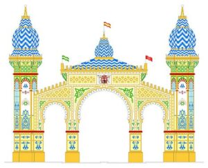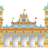 - Año 2018: la portada de 2018 conmemoró el 150 Aniversario del Círculo Mercantil e Industrial de Sevilla, destacando la antigua caseta arabesca de 1905 como motivo principal. La triple arquería inferior reflejaba esta emblemática estructura. El espacio entre los arcos inferiores y el superior aligeraba visualmente el conjunto, inspirándose en el arco de los Pavones del Salón de Embajadores del Real Alcázar. El remate superior, con el escudo de Sevilla rodeado por banderas de España y Andalucía, se basaba en el templete erigido en 1862 durante la visita de la Reina Isabel II. Las dos torres laterales, influenciadas por el edificio de Manuel Nogueira en la Plaza de la Campana de 1907, homenajeaban al arquitecto Aníbal González, destacado representante del mudéjar sevillano.con una altura de 40 metros y un ancho de 50 metros, estaba iluminada por 25.000 bombillas y presentaba una armoniosa combinación de colores amarillos y azules, característicos del Círculo Mercantil. El diseño se inspiraba en la caseta Embajadores que la entidad instaló en la feria de 1905, destacando su estilo arabesco o mudéjar.