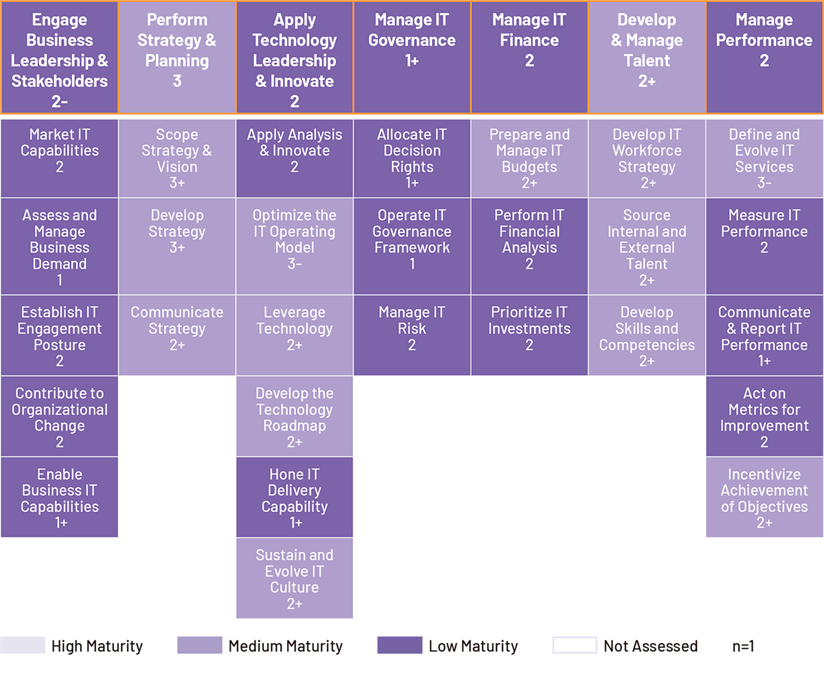 Maturity: Measured on a scale ranging from 1 (Low) to 5 (High), maturity measures how advanced an organization’s development is in a functional activity relative to Gartner’s best practice research. Maturity scores are refined with a (+) or (-) to indicate intermediate levels of maturity.
