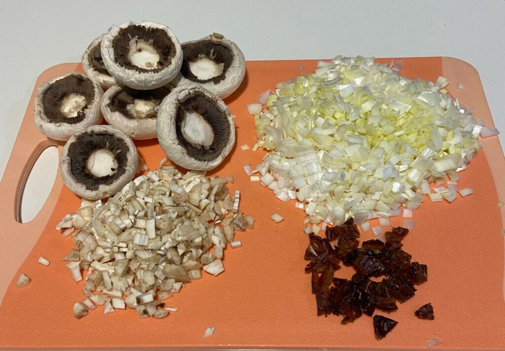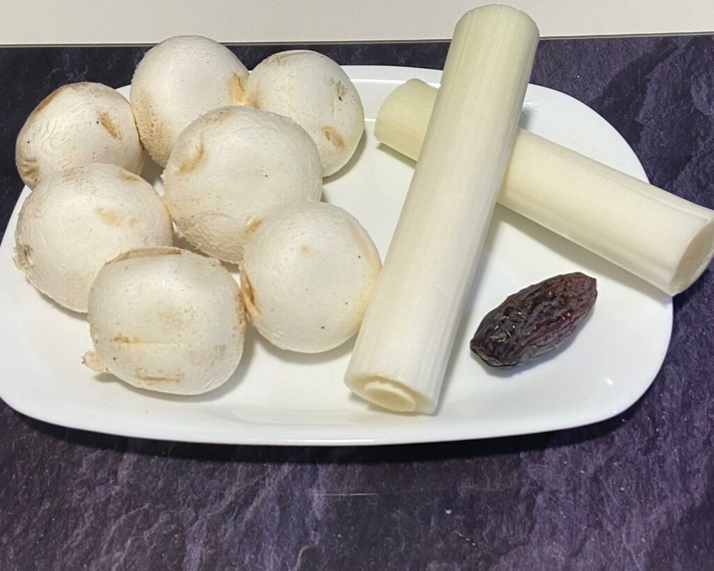 • Trocea los dos puerros, los troncos de los champiñones y el dátil