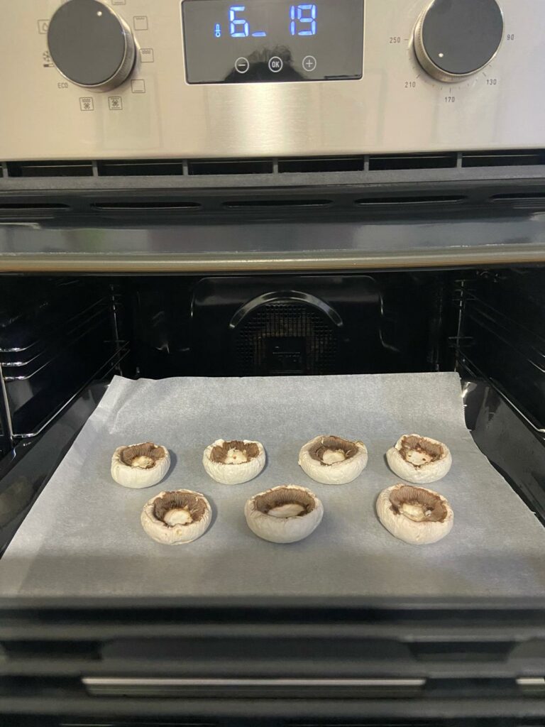 • Precalentar el horno durante 10 minutos a 180º. En bandeja de horno ponemos boca arriba y horneamos los champiñones durante 10 minutos más. Pasado este tiempo le damos la vuelta para que suelten el agua y horneamos otros 2 minutos más.