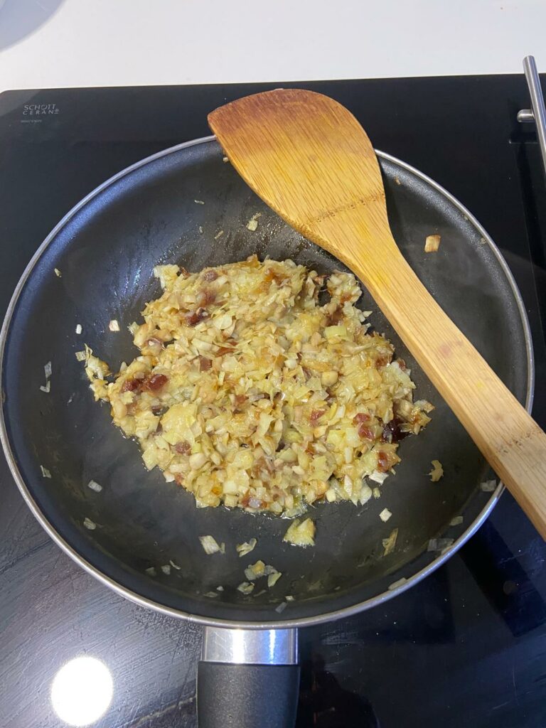 • Pocha en una sartén junto con aceite de oliva todo lo troceado(puerros, troncos y dátil)