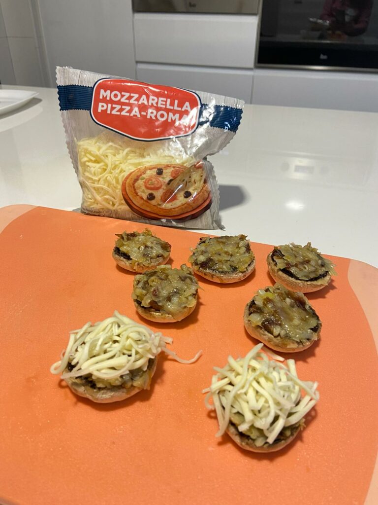 • Rellenamos cada champiñón con el relleno y cubrimos con un poquito de mozzarella cada uno