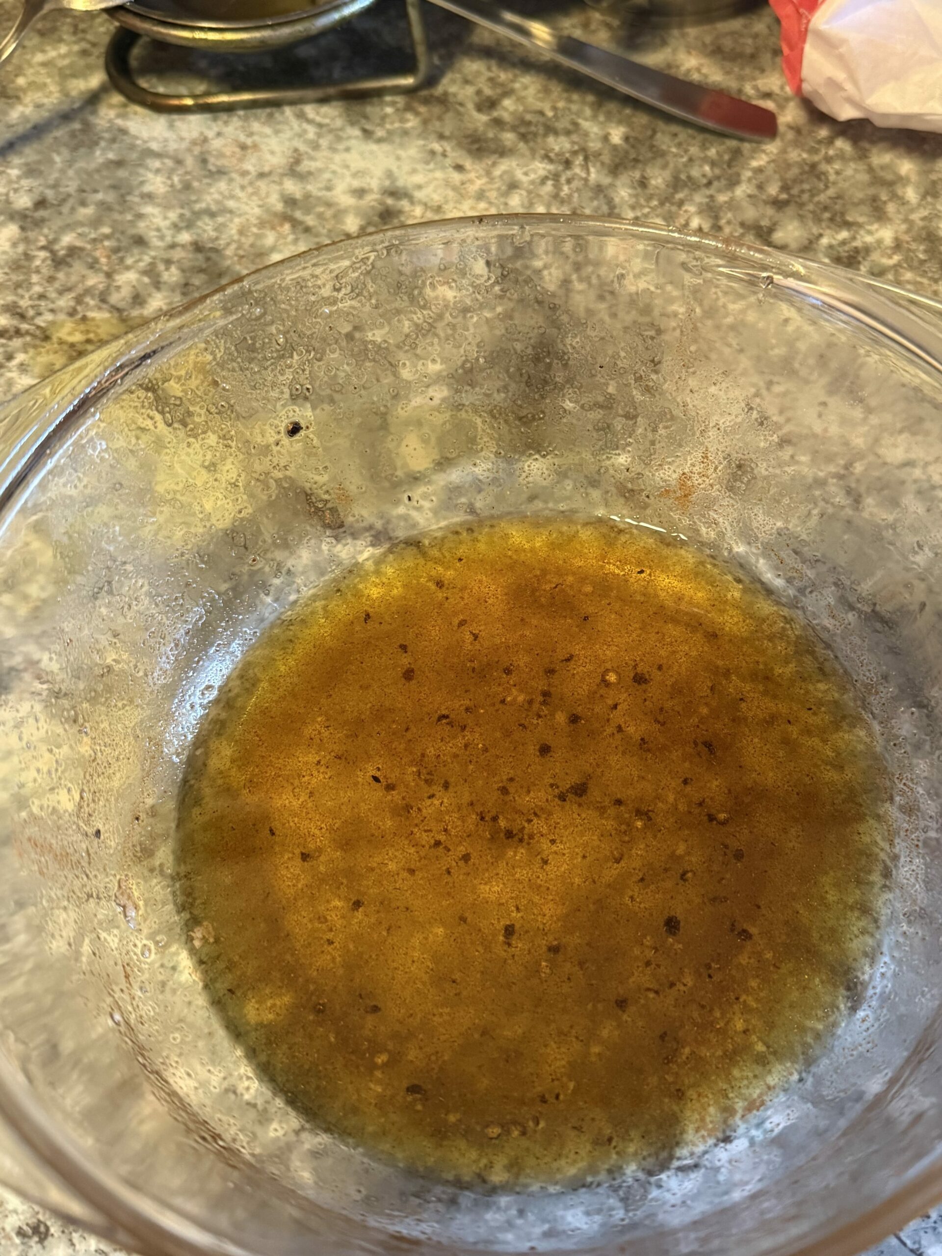 - En un bol, agregar el aceite, la sal, la pimienta y el pimentón dulce.