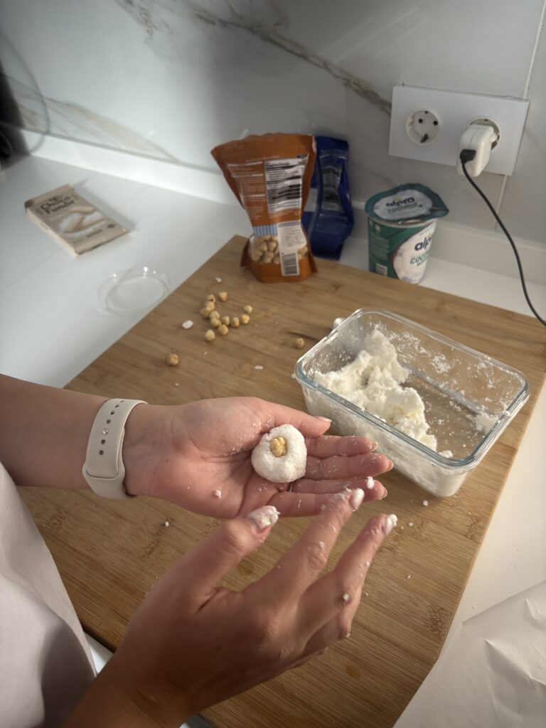 Os presento esta inspiración a los bombones Raffaello versión saludables. Pequeños, dulces y con un sabor que engancha desde el primer bocado. Estos bombones estilo Raffaello caseros destacan por su intenso toque a coco, una textura firme y ligeramente granulosa que los hace únicos, y una cobertura suave de chocolate blanco que los envuelve por completo. Una versión sencilla y más ligera del clásico, perfecta para disfrutar de algo dulce sin excesos pero con todo el placer.