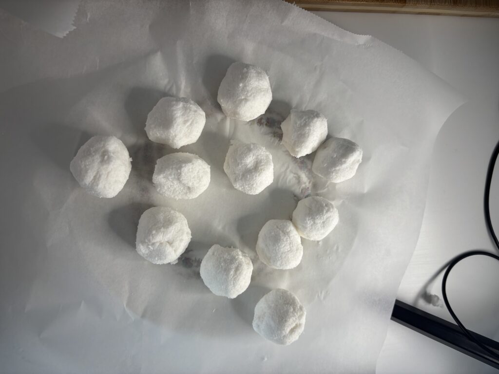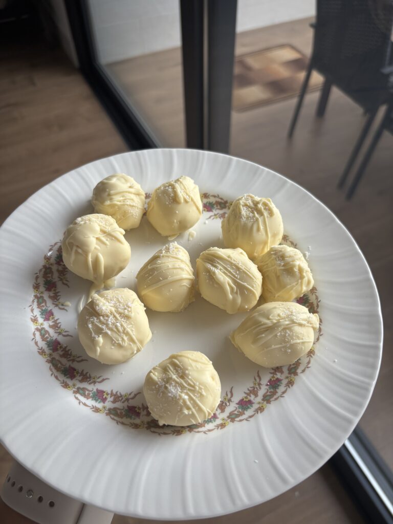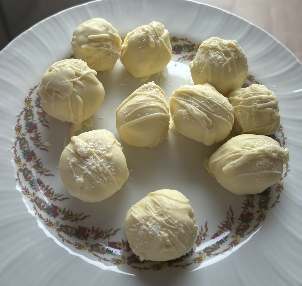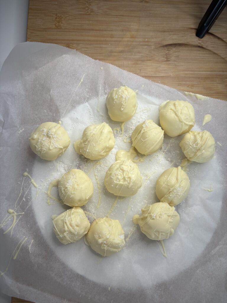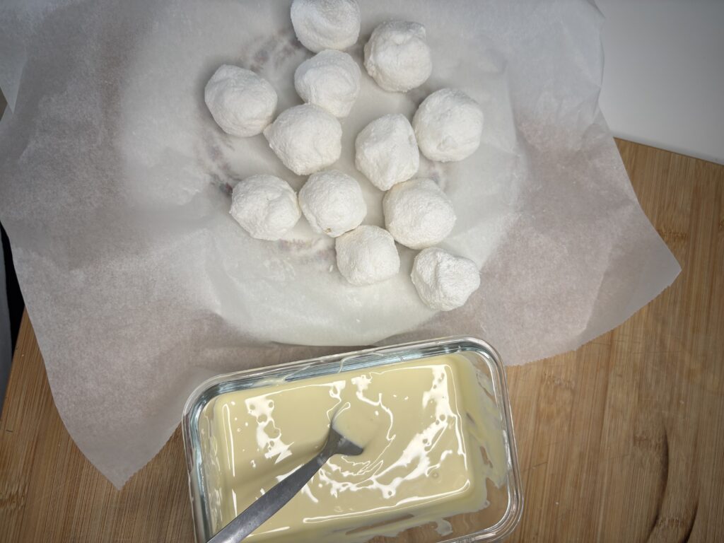 Bañamos las bolitas de coco en chocolate blanco