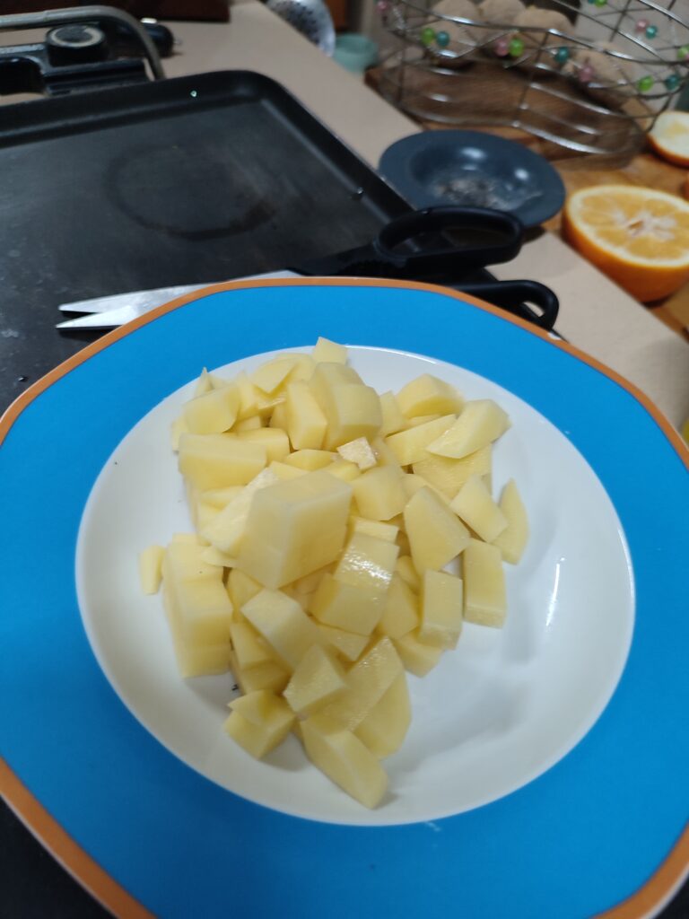 2. Corta la pechuga en dados pequeños, así como pela, lava y corta la patata en un tamaño similar, y reserva.