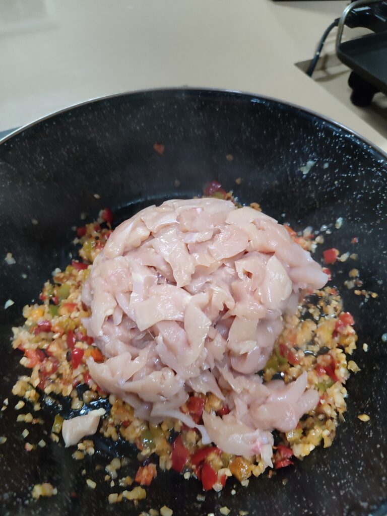 3. Añade la pechuga a la olla, y remueve, hasta que empiece a dorar.