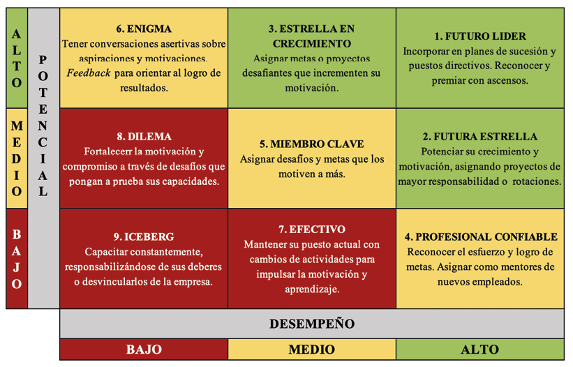 Además de la ubicación de cada colaborador, la matriz brinda información para la gestión del talento. A continuación, en la figura 2, se presenta un resumen de las recomendaciones.