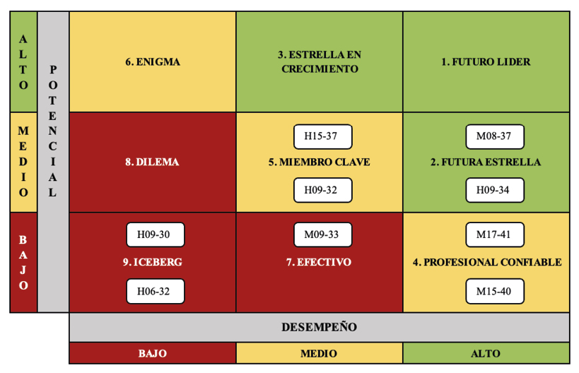 Se observa que hay cuatro cajas que no tienen empleados asignados: 1 (futuro líder), 2 (estrella en crecimiento), 6 (enigma) y 8 (dilema). El 33 % de los colaboradores se encuentra mapeado en el grupo de talento reducido, el 44 % en el grupo de futuras promesas y solo el 22 % en el grupo elite.
