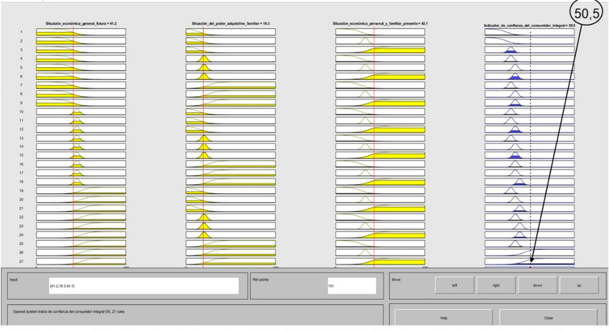 Lo anterior señala que las reglas difusas captan la sensibilidad del consumidor de forma más holística sobre su situación económica ya que contempla no sólo la situación económica general futura, sobresale de manera especial la variable ‘Situación del poder adquisitivo familiar’ abarcando múltiples aspectos como la compra de ropa, zapatos, alimentos, la posibilidad de salir de vacaciones, de ahorrar, hasta la posibilidad de comprar un auto nuevo o usado, entre otros gastos. Cabe mencionar que este aspecto está muy limitado en la versión utilizada por el INEGI ya que sólo utiliza la P8 ‘Posibilidad actual de comprar bienes duraderos’. Es decir, la variable de entrada en el SID, promedia las preguntas: P7, P8, P9, P10, P14 y P15, lo que provoca una medición más sensible.