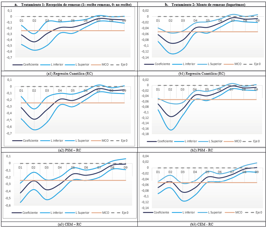 Los estadísticos descriptivos para el año 2015 (ver tabla 4 del anexo 3), muestran que el 2,9 % de los hogares recibe remesas, con un patrón marcadamente regresivo; 4,9 % en el quintil 1 y un 1,7 % en quintil 5. Este patrón anticipa un impacto distribucional diferenciado, más intenso en la cola inferior de la distribución salarial. Por otra parte, a medida que el ingreso aumenta, crece la proporción de hombres en la muestra (de 44,4 % a 83,4 %), es decir en los quintiles de mayores ingresos es más difícil encontrar mujeres. Igualmente, a medida que el ingreso aumenta, crece la proporción de personas que residen en zonas urbanas (de 50,5 % a 78,5 %), al igual que la cobertura de Seguro Social (de 28,6 % a 68,2 %), mientras que disminuye la presencia rural e indígena, lo que sugiere mayor formalidad y capital humano más altos en los quintiles de mayores ingresos. En la actividad productiva, la participación del sector servicios sube de 15,4 % a 54,5 % y la del primario cae de 61,1 % a 14,0 %; el trabajo por cuenta propia sigue siendo elevado (≈44-56 %), pero desciende levemente en los quintiles superiores, reflejando cierta transición hacia empleos asalariados formales. Patrones similares se observan para el año 2020 entre los estratos de ingresos (datos disponibles a solicitud a los autores). Estos patrones indican que las remesas podrían elevar el salario de reserva y reducir la aceptación de empleos precarizados en los grupos de menor ingreso, lo que respalda la estrategia empírica del estudio basada en regresiones cuantílicas para captar efectos heterogéneos.