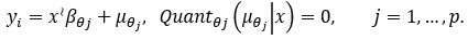 Donde Quantθ (yi│xi ) es el cuantil condicional de yi , condicionado al vector de regresores xi. Si Fμθ (∙) sería conocida, se podría utilizar varias técnicas para estimar βθ ; sin embargo, la distribución del término de error μθi no está especificada. Únicamente se asume en (1), que μθi cumple la restricción cuantílica de Quantθ (μθi│xi )=0.