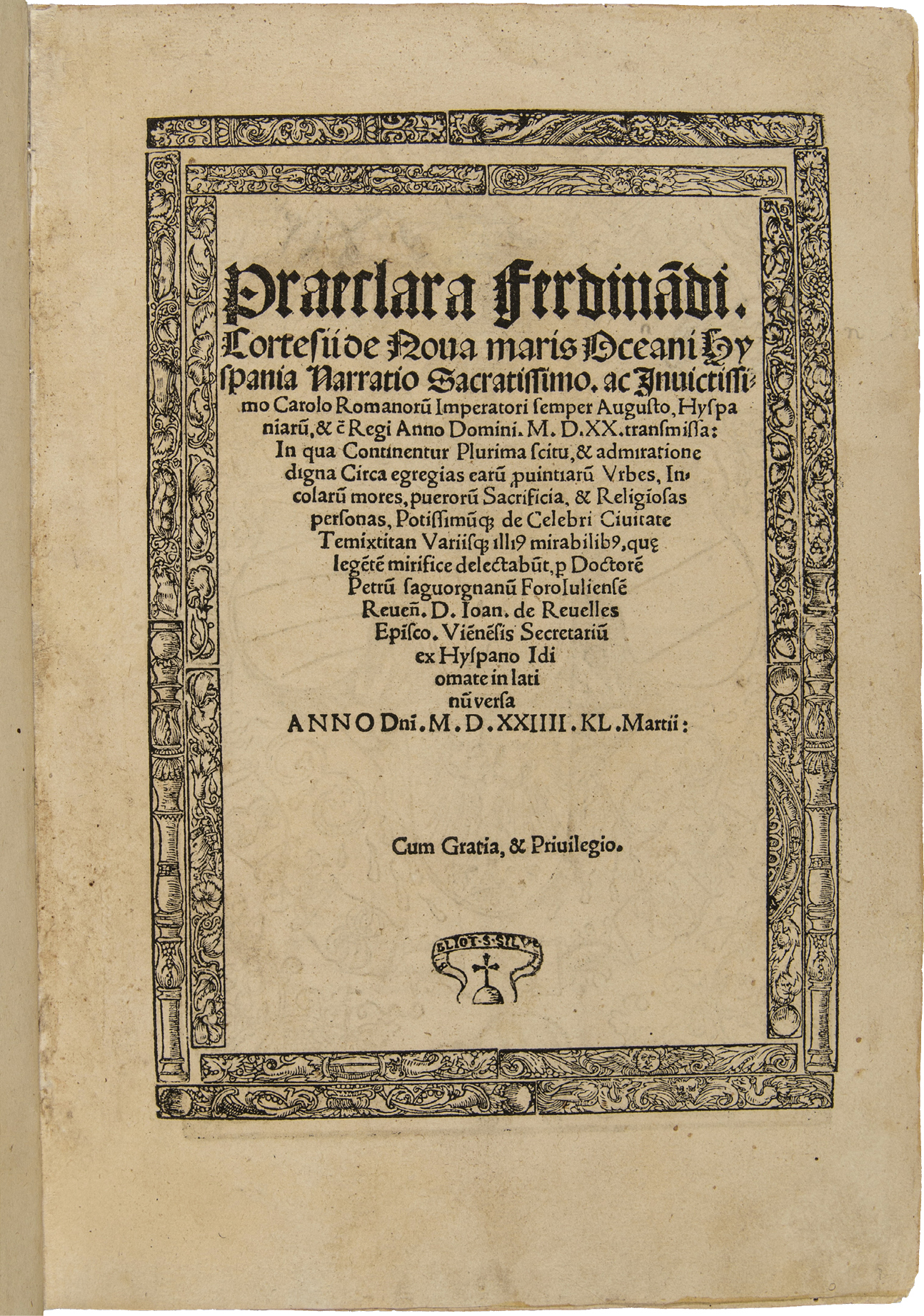 Cortés, Hernán. Carta de relaciõ ẽbiada a su S. majestad del ẽperador nuestro señor por el capitã general dela nueua spaña llamado fernãdo cortes. Sevilla: Jacobo Cromberger, 1522.