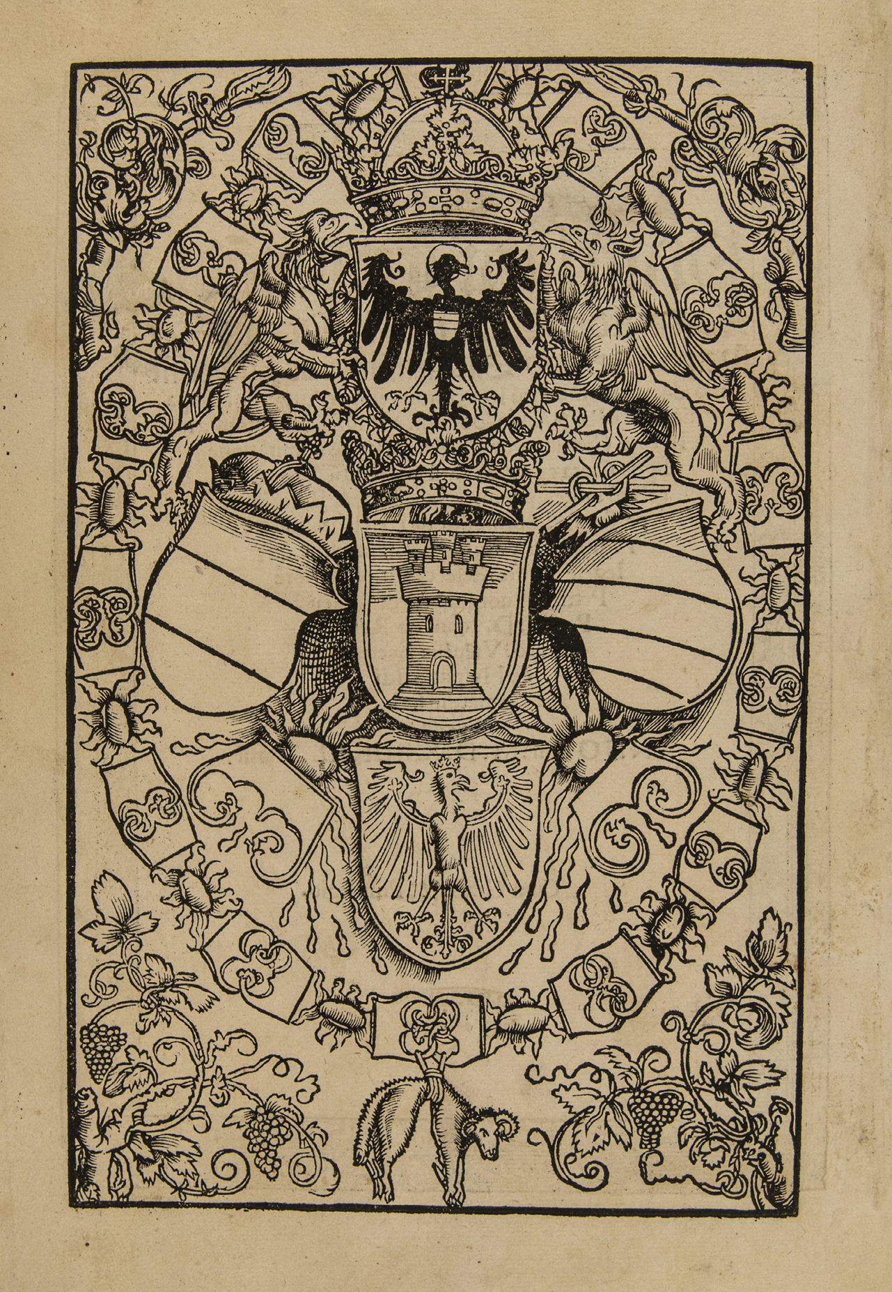 Diversas investigaciones señalan que el diseño final del Plano se produjo en un taller de grabadores de Nuremberg, los cuales adaptaron la imagen indígena de Tenochtitlan a la tradición heredada de las vistas de ciudades de las Crónicas de Nuremberg[42]. El estilo del arte renacentista de la Europa del norte se deja ver en el diseño de las edificaciones, las canoas circulando en el lago, e incluso en el contrapposto del ídolo de piedra. Estas y otras marcas han hecho pensar a Röttinger que la autoría del Plano recae en Erhard Schön, colaborador frecuente de Peypus durante la segunda década del siglo XVI [43]. No obstante, tanto el reciente catálogo de este artista preparado por Mielke [44] como también el estudio de Gresle-Pouligny han desestimado esta atribución. Por otro lado, algunas investigaciones han notado la similitud entre el Plano y el Mapa de Viena de 1530, en cuyo diseño estuvo involucrado otro artista nuremburgués, Sebald Beham [45]. Un detalle no menor es la atribución del diseño del escudo de armas de Johannes von Revellis a Beham, xilografía preparada en 1524 (Fig. 7), lo que conecta a este artista con un personaje clave en la producción de la Praeclara. Sin embargo, a falta de un monograma u otra evidencia de archivo que señale la autoría del diseño del Plano, su atribución solo puede relacionarse con el círculo de artistas de Nuremberg.