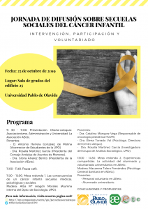 El próximo día 25 de octubre de 2019 se celebrará en la Sala de Grados del edificio 25 (Biblioteca) de la Universidad Pablo de Olavide la «I Jornada de Difusión sobre Secuelas Sociales del Cáncer Infantil: intervención, participación y voluntariado» .