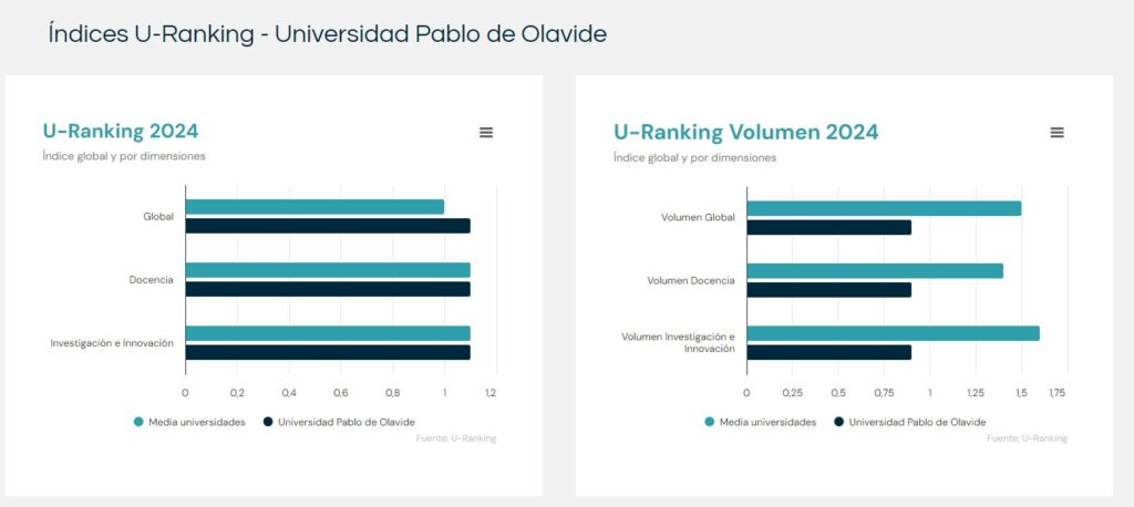 La Universidad Pablo de Olavide obtiene un rendimiento de un 10 por ciento superior a la media, con un índice de 1,1 tanto en docencia como en investigación e innovación, según el U-Ranking 2024, elaborado por la Fundación BBVA y el Instituto Valenciano de Investigaciones Económicas (Ivie).