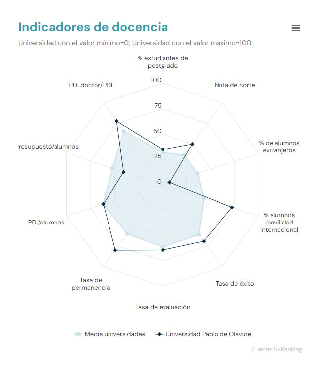 En docencia, con un índice de 1,1, la UPO destaca sobre la media del Sistema Universitario Español (SUE) en las tasas de éxito, evaluación y permanencia en estudios de grado; en el porcentaje de alumnos y alumnas que participan en programas de movilidad internacional; en las notas de corte de las titulaciones y en la proporción de profesorado doctor.