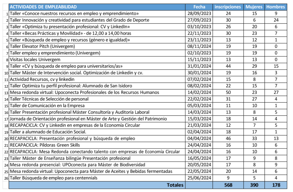 Durante el curso 2023/2024 se atendieron en este servicio a 184 usuarios (en citas personalizadas) y se realizaron 26 talleres grupales de empleabilidad, con la asistencia de 568 participantes. En la siguiente tabla se recoge el listado de talleres impartidos: